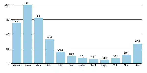 Le débit moyen mensuel observé en septembre (minimum d'étiage) est de 12,4 m3/s, soit plus ou moins 16 fois moins que le débit moyen du mois de février (200 m3/s), ce qui témoigne de l'amplitude assez importante des variations saisonnières. Sur la durée d'observation de 23 ans, le débit mensuel minimal a été de 8,89 m3/s (en ), tandis que le débit mensuel maximal s'élevait à 483 m3/s en .
