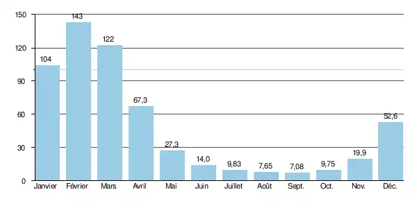 Le débit moyen mensuel observé en septembre (minimum d'étiage) est de 7,08 m3/s, soit plus ou moins 20 fois moins que le débit moyen du mois de février (143 m3/s), ce qui témoigne de l'amplitude importante des variations saisonnières. Sur la durée d'observation de 23 ans, le débit mensuel minimal a été de 5,0 m3/s (à plusieurs reprises en septembre-octobre), tandis que le débit mensuel maximal s'élevait à 261 m3/s en .