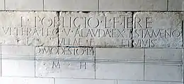 Traduction : à Lucius Poblicius, fils de Lucius, de la tribu Teretina, vétéran de la Ve légion Alauda, selon son testament, à sa fille Paulla, du vivant de... et à sa femme..., et à Lucius Poblicius, à son fils et aux affranchis Lucius Poblicius Modestus et Lucius Poblicius ... Le monument n'ira pas à ses héritiers.