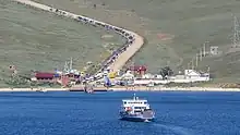 Le principal moyen d'accès à l'île d'Olkhon est les ferries des portes d'Olkhon, qui sont des bacs faisant des rotations en continu la journée entre mai et décembre. Les bacs sont le « Dorojnik » et depuis 2008 le « Olkhonskiye Vorota » l'a rejoint. Le premier a une capacité de 50 personnes et de 12 voitures, le deuxième de 96 personnes et de 16 voitures. Depuis 2016, un troisième est entré en service, le « Semyon Batagaïev », avec une capacité identique à celui du deuxième. Les nouveaux bateaux ont permis de rendre la durée d'attente moins longue pendant la saison estivale, alors qu'auparavant les files d'attente pouvaient durer jusqu'à 6 à 8 heures, parfois même 10 à 12 heures. La première rotation commence à 7h00, la dernière finit aux alentours de 23h[22].