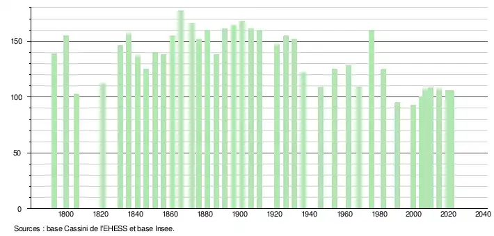 L'évolution du nombre d'habitants est connue à travers les recensements de la population effectués dans la commune depuis 1793. Pour les communes de moins de 10 000 habitants, une enquête de recensement portant sur toute la population est réalisée tous les cinq ans, les populations légales des années intermédiaires étant quant à elles estimées par interpolation ou extrapolation[15]. Pour la commune, le premier recensement exhaustif entrant dans le cadre du nouveau dispositif a été réalisé en 2004[16].
