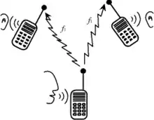 Les radios reçoivent les signaux des fréquences ƒ1 et ƒ2, mais seuls les signaux émis sur ƒ2 sont sélectionnés ; les stations à l'écoute reçoivent donc le message simultanément sur deux fréquences, mais seul celui venant du relais est restitué.