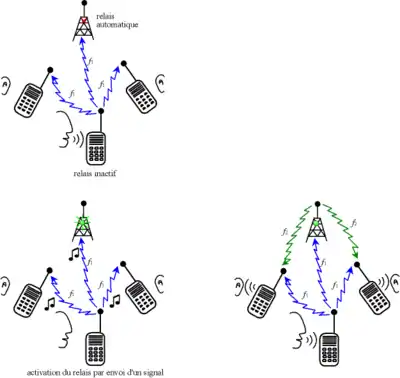 Lorsqu'il faut transmettre de manière fiable sur de grandes distances, on utilise des relais automatiques : il s'agit de stations fixes sans opérateur dont les antennes sont situées en hauteur. Les émetteurs (portatifs, mobiles ou fixes) émettent sur la fréquence ƒ1 et écoutent la fréquence ƒ2 ; deux émetteurs ne peuvent donc communiquer ensemble directement. En envoyant un appel sélectif particulier, cela active le relais ; celui-ci reçoit les messages sur la fréquence ƒ1 et les retransmet sur la fréquence ƒ2, ainsi, toutes les stations peuvent entendre les messages émis.