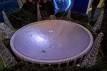 Schéma montrant le diamètre efficace (300 mètres) du réflecteur, les contours de celui-ci et la position de la cabine focale.