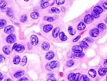 Les carcinomes épithéliaux de la thyroïde, c'est-à-dire le plus courant des sous-types de carcinomes papillaires (environ 70 %) et le carcinome folliculaire (environ 20 %), et leurs métastases ont encore des ressemblances marquées avec leur tissu d'origine. D'une part, ils expriment le symport Na/I et ont donc une possibilité de stockage de l'iode, d'autre part, ils produisent de la thyroglobuline, ce qui peut servir de marqueur de la tumeur. Les carcinomes de la thyroïde apparaissent souvent comme des nodules froids dans des scintigraphies thyroïdiennes, au sens où leur tendance au stockage de l'iode est moins marquée que dans le tissu thyroïdien sain environnant. Par stimulation avec de hautes concentrations de TSH, les cellules thyroïdiennes cancéreuses conservent leur capacité à stocker l'iode.