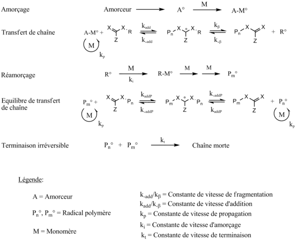 La RAFT repose sur un mécanisme de transfert de chaîne réversible qui se compose de 2 équilibres d'addition-fragmentation mettant en jeu un agent de transfert de type thiocarbonylthio (agents de transfert les plus utilisés). L'amorçage ainsi que la terminaison entre radicaux sont les mêmes qu'en polymérisation radicalaire classique. Après décomposition de l'amorceur (de type AIBN: azobisisobutyronitrile) en radicaux, la première espèce radicalaire produite s'additionne au monomère pour former un radical carboné qui va ensuite réagir rapidement avec l'agent de transfert pour former l'entité radicalaire correspondante. Cette dernière va se fragmenter en un amorceur et en un nouveau radical capable de réamorcer une polymérisation. La polymérisation RAFT vise à minimiser les réactions de terminaison irréversible grâce à la présence d'un nombre limité de radicaux dans le milieu réactionnel. Toutefois, il est possible qu'une telle réaction se produise entre deux espèces actives et notamment lorsque la concentration en amorceur est trop élevée (le rapport entre la concentration initiale en amorceur et la concentration initiale en agent de transfert doit être suffisamment bas).