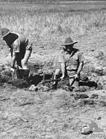 Deux soldats australiens à la recherche de fragments d'une bombe larguée lors du troisième raid sur Townsville.