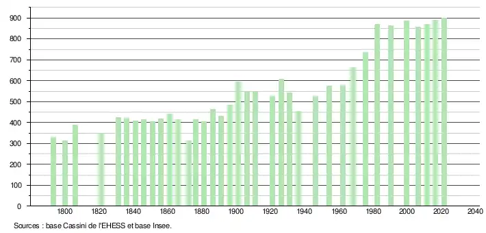 L'évolution du nombre d'habitants est connue à travers les recensements de la population effectués dans la commune depuis 1793. Pour les communes de moins de 10 000 habitants, une enquête de recensement portant sur toute la population est réalisée tous les cinq ans, les populations légales des années intermédiaires étant quant à elles estimées par interpolation ou extrapolation[19]. Pour la commune, le premier recensement exhaustif entrant dans le cadre du nouveau dispositif a été réalisé en 2006[20].