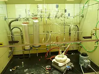 La rampe à vide est un appareil inventé par Wilhelm Schlenk afin de manipuler et de synthétiser des échantillons sensibles à l'air. Cet appareil comprend une double tubulure - une pour le vide et une pour le gaz inerte. Le vide est créé par une pompe mécanique. Un piège à froid contenant par exemple de l'azote liquide est placé entre cette pompe et la partie principale de la rampe à vide. Ce piège sert à recueillir la plupart des gaz et des liquides qui s'évaporent au cours de l'expérience, afin d'empêcher des composés organiques ou corrosifs d'endommager la pompe mécanique. L'azote liquide, dont le point d'ébullition est de -196 °C, sert à condenser les gaz ou les vapeurs qui traversent le piège. Cela est à l'origine de l'un des principaux dangers des rampes à vide : l'oxygène aussi se condense à cette température. L'oxygène liquide peut facilement exploser, et il faut l'éviter à tout prix.