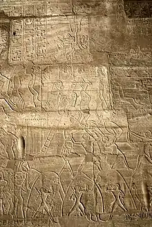 - sur la paroi extérieure du mur nord de la grande salle hypostyle du temple d'Amon à Karnak, le roi a faits modifier des représentations des campagnes du début du règne, l'une au Proche-Orient, la seconde contre les Tjéhénou (c'est à dire les Libyens), pour y faire apparaître son fils à la place d'autres personnages, dont l'un a parfois été pris comme un frère aîné de Ramsès, hypothèse aujourd'hui abandonné, le personnage précédemment représenté étant le commandant des archers et flabellifère Méhy[31] ;