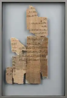 - le papyrus Harris, une chronique du règne de Ramsès III datée du règne de Ramsès IV, rapporte d'autres sites où aurait agi Ramsès III mais son nom n'y a pas été trouvé ; on peut citer Memphis, Hermopolis, Assiout, Thinis ainsi que des cites en Nubie et en Syrie[29].