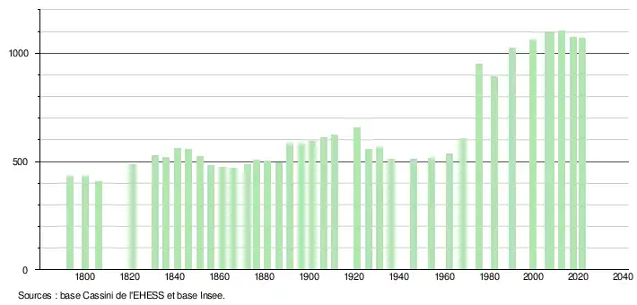 L'évolution du nombre d'habitants est connue à travers les recensements de la population effectués dans la commune depuis 1793. Pour les communes de moins de 10 000 habitants, une enquête de recensement portant sur toute la population est réalisée tous les cinq ans, les populations légales des années intermédiaires étant quant à elles estimées par interpolation ou extrapolation[35]. Pour la commune, le premier recensement exhaustif entrant dans le cadre du nouveau dispositif a été réalisé en 2007[36].