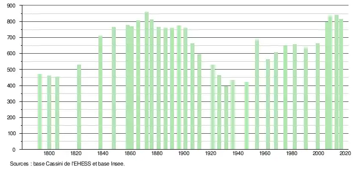L'évolution du nombre d'habitants est connue à travers les recensements de la population effectués dans la commune depuis 1793. Pour les communes de moins de 10 000 habitants, une enquête de recensement portant sur toute la population est réalisée tous les cinq ans, les populations légales des années intermédiaires étant quant à elles estimées par interpolation ou extrapolation[8]. Pour la commune, le premier recensement exhaustif entrant dans le cadre du nouveau dispositif a été réalisé en 2008[9].
