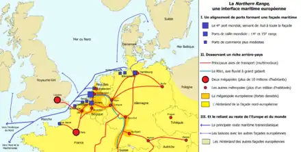 La rangée nord-européenne est la deuxième façade maritime mondiale (après les ports chinois de la mer Jaune : ports de Tianjin, de Qingdao, de Qinhuangdao, de Dalian, de Yingkou, de Tangshan, de Lianyungang, etc.) et la première européenne[n 7] (devant ceux de l'ouest de la Méditerranée : ports de Marseille, d'Algésiras, de Valence, de Gênes, de Trieste, de Barcelone, etc.). Elle sert de principale interface commerciale entre l'Europe et le reste du monde, servant de débouché de la mégalopole européenne.