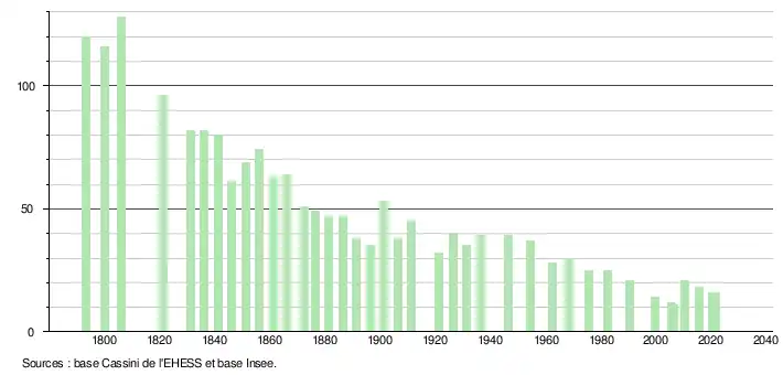 L'évolution du nombre d'habitants est connue à travers les recensements de la population effectués dans la commune depuis 1793. Pour les communes de moins de 10 000 habitants, une enquête de recensement portant sur toute la population est réalisée tous les cinq ans, les populations légales des années intermédiaires étant quant à elles estimées par interpolation ou extrapolation[20]. Pour la commune, le premier recensement exhaustif entrant dans le cadre du nouveau dispositif a été réalisé en 2005[21].