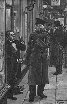 Scholl se venge en dénonçant les décorations portées illégalement par Du Bisson[46] et en publiant, dans le Lorgnon du , un article mordant à l'encontre du « pseudo-emprereur d'Abyssinie »[47]. Le , au coin de la rue de Provence et de la rue Drouot, une violente altercation oppose les deux hommes : Scholl cravache le visage du comte, tandis que celui-ci menace son ennemi d'un couteau-poignard. L'affaire est portée au tribunal. Au cours du procès, Du Bisson impressionne l'auditoire et les magistrats en se blessant volontairement la main avec son arme, pièce à conviction saisie après l'altercation, afin de prouver que sa pointe n'est pas empoisonnée[45]. Finalement, Scholl est condamné à verser cent francs d'amende et cinq cents francs de dommages-intérêts pour avoir diffamé le comte[48], et à 25 francs d'amende et 3 jours de prison pour l'avoir agressé[49].