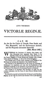 La première Constitution du Canada en tant que nation est l'Acte de l’Amérique du Nord britannique (AANB). Cette Constitution est une loi adoptée par le Parlement britannique en 1867. Par cette loi, le Canada était défini comme une « puissance » (dominion, en anglais) de l'Empire britannique dont les pouvoirs sont répartis entre le fédéral (comprenant la Chambre des communes, le Sénat et la Couronne), les provinces (à l'origine le Québec, l'Ontario, le Nouveau-Brunswick et la Nouvelle-Écosse) et le système judiciaire[1].