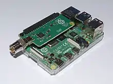 Le Raspberry Pi est un nano-ordinateur monocarte à processeur ARM de la taille d'une carte de crédit conçu par des professeurs du département informatique de l'université de Cambridge dans le cadre de la fondation Raspberry Pi[3].