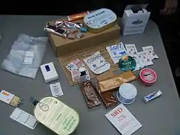 - un ensemble de réchauffage (dont six comprimés de purification d'eau et un sac à déchets) ;