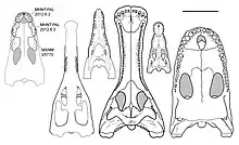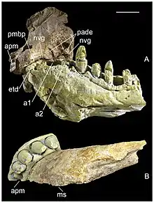 Comme le museau, la mâchoire inférieure est grande et robuste. De manière unique, la pointe de la mâchoire inférieure est dépourvue de dents, pour une section de l’os dentaire correspondant au diamètre de plus d’une dent. L'avant de la mâchoire aurait été fusionné; à l'intérieur de l'os, il y a une cicatrice qui longe à l'arrière 20% de la partie soudée, représentant la fixation de l'os splénial. Comme la prémaxillaire, la surface externe du dentaire est texturée et comporte un réseau dense de canaux en zigzag pour les vaisseaux sanguins (c'est-à-dire les canaux vasculaires). Sur la surface intérieure, immédiatement adjacente à la rangée de dents, se trouve une rangée de creux qui s’enfoncent dans une gorge vers l’arrière de la mâchoire. Le bord supérieur de l'os est convexe à l'avant, puis se transforme en une région concave[2].