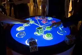 La réactable est une interface qui permet de modifier les composantes d'un synthétiseur modulaire. Il se présente sous la forme d'une surface ronde ayant au centre un point (la sortie du son), sur laquelle on dispose des blocs représentant chacun des éléments du synthétiseur. Les éléments sont reliés entre eux virtuellement comme dans un circuit électrique. Le joueur peut modifier leurs interactions en faisant varier la distance séparant deux éléments reliés, la fréquence du signal en faisant pivoter l'élément, l'amplitude en déplaçant son doigt autour de l'élément, etc. Une caméra située en dessous de la table permet d'analyser la disposition des éléments, ainsi que les mouvements des doigts du joueur. Un projecteur émet des effets lumineux créant ainsi les liaisons entre les éléments, mais aussi des réflexions que la caméra pourra détecter comme étant un objet.