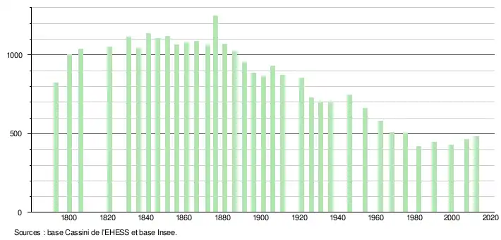 L'évolution du nombre d'habitants est connue à travers les recensements de la population effectués dans la commune depuis 1793. À partir du , les populations légales des communes sont publiées annuellement dans le cadre d'un recensement qui repose désormais sur une collecte d'information annuelle, concernant successivement tous les territoires communaux au cours d'une période de cinq ans. Pour les communes de moins de 10 000 habitants, une enquête de recensement portant sur toute la population est réalisée tous les cinq ans, les populations légales des années intermédiaires étant quant à elles estimées par interpolation ou extrapolation[2]. Pour la commune, le premier recensement exhaustif entrant dans le cadre du nouveau dispositif a été réalisé en 2007[3],[Note 1].