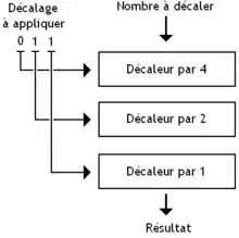 Un circuit capable d'effectuer des décalages logiques est conçu sur un principe très simple. Par exemple, décaler un nombre de 7 rangs vers la droite, c'est le décaler de 4 rangs, puis le décaler de 2, puis le décaler de 1. On voit que notre décalage par 7 peut être décomposé en plusieurs sous-décalages par 4, 2 et 1. Et bien c'est la même chose pour tous les autres décalages : ceux-ci peuvent être décomposés en décalages de n rangs, avec n une puissance de 2.