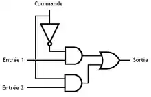 Tous les barrels shifters sont conçus avec des couches de multiplexeurs. Ces multiplexeurs sont des circuits électroniques dont le rôle est de recopier le contenu d'une des entrées sur sa sortie. Ce multiplexeur permet de choisir l'entrée qu'on veut recopier sur la sortie : pour cela, notre multiplexeur contient une entrée de commande qui permet de spécifier quelle entrée doit être recopiée. Dans les barrels shifters, les multiplexeurs utilisés possèdent deux entrées et une sortie, et ressemblent à celui illustré dans le schéma de droite.