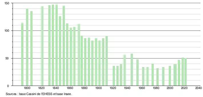 L'évolution du nombre d'habitants est connue à travers les recensements de la population effectués dans la commune depuis 1793. Pour les communes de moins de 10 000 habitants, une enquête de recensement portant sur toute la population est réalisée tous les cinq ans, les populations légales des années intermédiaires étant quant à elles estimées par interpolation ou extrapolation[16]. Pour la commune, le premier recensement exhaustif entrant dans le cadre du nouveau dispositif a été réalisé en 2007[17].