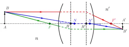 Un système optique centré est un système optique qui présente un axe de rotation nommé axe optique. Il peut être entouré de milieux différents d'indices de réfraction en amont et en aval. Il est caractérisé par ses points cardinaux parmi lesquels les points principaux objet et image , les foyers objet et image . Les distances focales objet et image sont définies par : et . est sa vergence. Si le système peut être considéré stigmatique, les positions d'un objet situé sur l'axe optique et de son image , elle aussi sur l'axe optique, peuvent être liées entre elles grâce à l'une ou l'autre des deux relations de conjugaison.