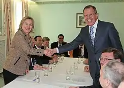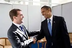 Bien que les relations américano-russes aient été tendues sous l'administration Bush, le président russe Dmitri Medvedev (président de à , avec Vladimir Poutine à la tête du gouvernement) et le président américain Barack Obama donnent un ton chaleureux au sommet du G20 de 2009 à Londres. Ils publient une déclaration commune qui promet un « nouveau départ » dans les relations russo-américaines. La déclaration appelle également l'Iran à abandonner son programme nucléaire et à autoriser des inspecteurs étrangers dans le pays. En , la secrétaire d’État américaine Hillary Clinton et son homologue russe Sergueï Lavrov appuient symboliquement sur un bouton de "réinitialisation"[réf. souhaitée].