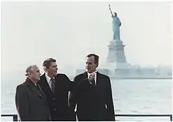 Le leader soviétique Mikhail Gorbachev rencontre Ronald Reagan et le président élu George H. W. Bush à New York en décembre 1988