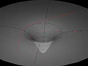 Comme dans le cas d'un espace plat où le référentiel de l'observateur est en rotation autour d'un axe, par rapport à un référentiel inertiel, l'observateur perçoit comme courbés les mouvements rectilignes uniformes du référentiel inertiel.
