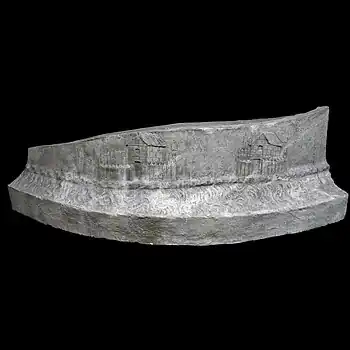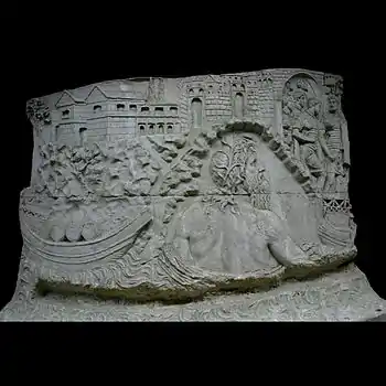 | III | Le rivage est devenu abrupt mais quelques arbres parviennent à pousser entre les rochers. En arrière, la ville continue de s'étendre, riche en monuments. L'un d'entre eux est bien visible au centre, le rez-de-chaussée pourvu d'arcades. Les épaisses murailles de la ville, construites en pierre de taille et couronnées de créneaux, sont percées de plusieurs portes cintrées. Au milieu, assis dans une grotte sur le bord du Danube, la divinité associée au fleuve, le dieu Danuvius ou Ister, la tête ceinte de plantes aquatiques, observe l'armée romaine qui sort de la ville[32]. |