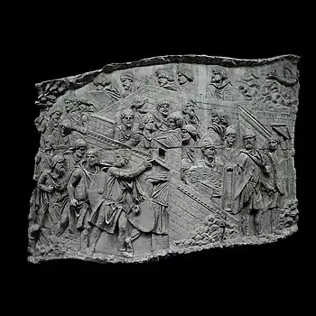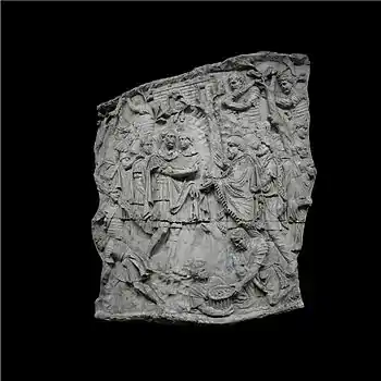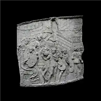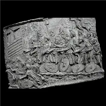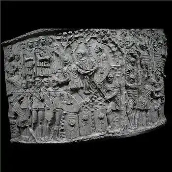 | XLII | Bataille d'Adamclisi[a 6] La cavalerie romaine engage le combat contre les Daces qui ont pris position sur une colline, tandis que les légions attaquent de front, soutenues par des auxiliaires germains. L'armée dace, défaite, tente de fuir à travers les bois. Le chemin est couvert de morts et de blessés. |