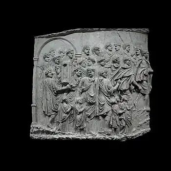 Donativa Trajan, entouré de son état-major, assis sur un siège pliant (stella castrensis), distribue des décorations aux soldats auxiliaires qui se sont illustrés au combat[57]. Le soldat qui vient d'être décoré exprime sa reconnaissance et embrasse la main de l'empereur. En dessous, ses camarades le félicitent. Prisonniers romains À droite, trois prisonniers romains, nus, sont soumis au supplice des torches par des femmes daces[45],[58]. |