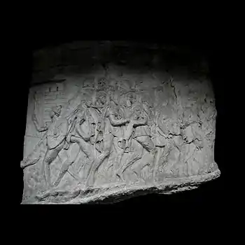 | XXXVIII | Bataille nocturne de Nicopolis Tout à fait à gauche, on distingue le buste de la Nuit (Nox) qui se drape de son châle, indiquant que la scène se déroule à la nuit tombée. Les Romains, secondés par des auxiliaires germains (torse nu et armés de massues), attaquent les Daces par surprise[48]. En arrière, on aperçoit les chariots daces chargés de butin qui les empêchent de manœuvrer rapidement. La ville de Nicopolis ad Istrum est fondée plus tard par Trajan à proximité du lieu de la bataille[48]. Son nom célèbre cette victoire[a 4],[a 5]. |