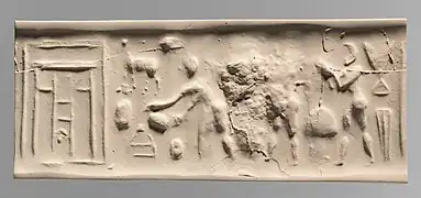 Parmi les premières tablettes administratives, datées de la fin de la période d'Uruk (c. 3200-3000 av. J.-C.), certaines semblent faire référence à des offrandes pour des divinités et à un personnel religieux, même si elles sont souvent encore mal comprises. Les représentations artistiques comme les sceaux-cylindres et le grand vase d'Uruk paraissent indiquer qu'à partir de cette époque les divinités sont représentées sous forme humaine (anthropomorphisme), indiquant une évolution de la pensée religieuse. Les textes de la première moitié et du milieu du IIIe millénaire av. J.-C. (période des dynasties archaïques), exhumés à Ur, et surtout Abu Salabikh, Shuruppak et Ebla (située en Syrie mais influencée par la culture mésopotamienne[21]) comportent les premiers textes mythologiques, rituels et hymniques connus[22]. Les traits caractéristiques de la religion mésopotamienne semblent déjà en place même si les zones d'ombres restent nombreuses en raison du nombre limité de textes.