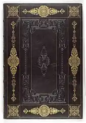 L'art gothique atteint son apogée avec la parution du premier tome des Voyages pittoresques et romantiques dans l'ancienne France en 1820[32], comportant de nombreuses monographies de cathédrales françaises, qui constitue le premier recueil du patrimoine français[32]. Des reliures décorées à la plaque ou aux fleurons inspirés de l'architecture gothique, dites « à la cathédrale » (avec figuration d'ogives, de rosaces, de fenestrages), sont exécutées massivement dans beaucoup d'ateliers[20], dont ceux de Thouvenin, de Simier, puis plus tard d'Antoine Bauzonnet et de son successeur Trautz[33],[34]. Les allures parfois austères des décors aux filets dorés de Bauzonnet, accentuées par les couleurs sombres de ses reliures, ont contrasté avec l'aspect plus riche de celles produites par les autres ateliers[20],[35]. La publication en 1831 de Notre-Dame de Paris apparaît comme le point culminant du goût pour le gothique-romantique[20],[35].