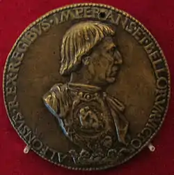 Alphonse V fait dessiner sa propre médaille par Pisanello en 1449 à une échelle digne du roi d'un grand empire. Il est représenté vêtu d'une armure contemporaine, dans un profil classique, comme il convient à un général et à un souverain. Son casque à aigrette et un livre ouvert se trouvent à sa gauche, sa couronne et la date de la médaille à sa droite. L'inscription dit « Divus Alphonsus Rex » en haut et « Triumphator et Pacificus » en bas. L'emploi du mot « Divus », « saint », l'associe aux premiers empereurs romains, dont plusieurs furent déifiés après leur mort. Le roi est célébré comme vainqueur militaire et comme pacificateur[4].
