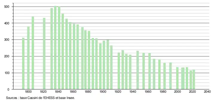 L'évolution du nombre d'habitants est connue à travers les recensements de la population effectués dans la commune depuis 1793. Pour les communes de moins de 10 000 habitants, une enquête de recensement portant sur toute la population est réalisée tous les cinq ans, les populations légales des années intermédiaires étant quant à elles estimées par interpolation ou extrapolation[24]. Pour la commune, le premier recensement exhaustif entrant dans le cadre du nouveau dispositif a été réalisé en 2007[25].