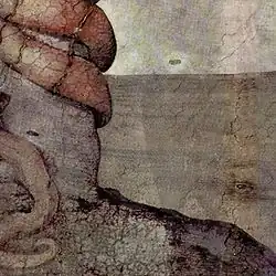 | Détail de l’Expulsion de l'Éden avant restauration : obscurcissement, fissuration, dépôts métalliques dus aux interventions anciennes, taches d'humidité, dépôts de sel et de salpêtre, et divers repeints. | Détail de la fresque après restauration, montrant l'éclat des couleurs et les réparations des fissures les plus importantes. Les petites fissures sont encore visibles. Les anneaux de salpêtre sont irréversibles. |