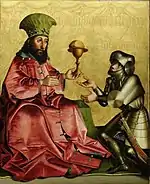 En bas à gauche : saint Barthélemy | 99,5 | 70,0 (en haut), 69,7 (en bas) | Bord original à gauche, coupé à droite ainsi qu'en haut et en bas où une languette complète partiellement les parties manquantes | Kunstmuseum (Bâle) |