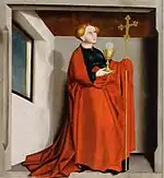 En bas à gauche : saint Augustin (ou saint Thibault ?) | 103,0 | 81,5 | Panneau à peine coupé sur les bords | Musée des beaux-arts de Dijon |
