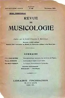 La Société française de musicologie est fondée le . L’éditorial inaugural en précise le projet : « [La Société française de musicologie] réunit la plupart des personnes qui s’adonnent aux recherches musicologiques; son but est l’étude de l’Histoire de la Musique et des Musiciens, de l’Esthétique et de la Théorie musicales. Ses moyens d’action consistent dans la publication d’un Bulletin périodique, et, éventuellement, de documents, textes et travaux de toute nature concernant la Musicologie[1]. » Ses statuts présentent, dès l’article 2, « les moyens d’actions de la Société [...] : 1° La publication d’un Bulletin périodique, comprenant les actes de la Société, les comptes rendus de ses séances, des articles et mémoires peu étendus, enfin une partie bibliographique ; 2° La publication de documents, textes musicaux, mémoires ou études de musicologie, dans la mesure où ses ressources le permettrons[2]. »