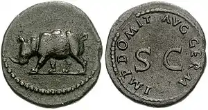L'image de ce rhinocéros fut reproduite sur de petites monnaies de bronze appelées quadrantes, certaines datées de Domitien, d'autres sans nom d'empereur. Sur ces monnaies au rhinocéros figurent aussi parfois des emblèmes de la déesse Minerve.