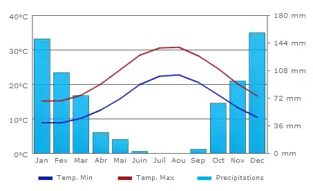 | Température maximale moyenne (°C) | 15,1 | 15,2 | 16,8 | 20 | 24,2 | 28,4 | 30,5 | 30,7 | 28,2 | 24,5 | 20,1 | 16,6 | 22,5 |