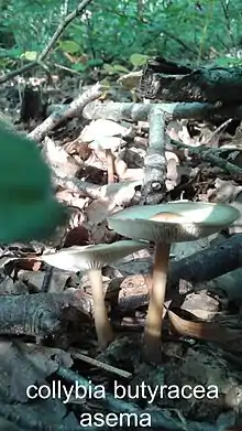 Rhodocollybia butyracea var. asema, la Collybie beurrée variété asema, est une variété de la Collybie beurrée qui s'en différencie en étant plus svelte et plus pâle que la variété type, tirant sur le gris, au pied gris-brun (pâle en haut) et non brun-rouge, moins renflé, plus cylindrique. Le chapeau gris de corne et les lames entières, non crénelées.