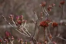 Les feuilles sont alternes et dressées. La nervure principale est couverte de poils roux sur les deux faces. Le dessous des feuilles est recouvert de courts poils blancs.