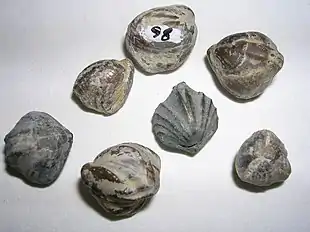 Les rhynchonelles sont des brachiopodes fossiles marins fixés. Ils sont reconnaissables à leur coquille à section en zigzag, ce qui les distingue notamment des térébratules.